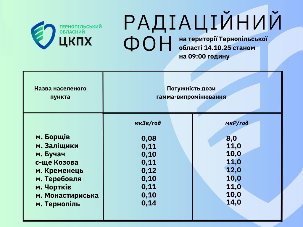 Показники радіаційного фону в Тернопільській області знаходяться в межах норми та не перевищують природний радіаційний фон, характерний для Тернопільщини.