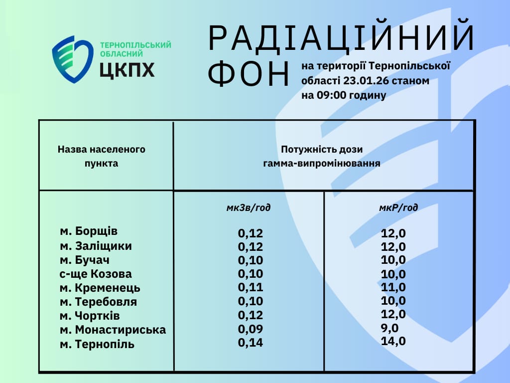 Показники радіаційного фону в Тернопільській області знаходяться в межах норми та не перевищують природний радіаційний фон, характерний для Тернопільщини.