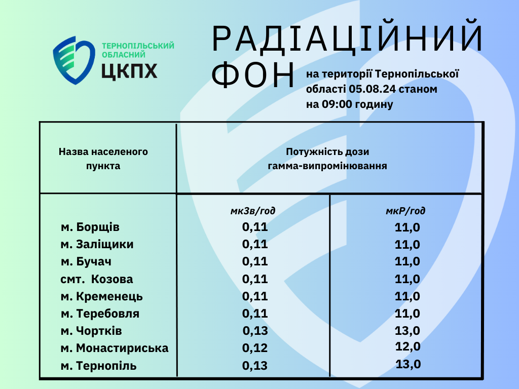 Радіаційний фон на території Тернопільської області 05.08.24 станом на 09:00 годину