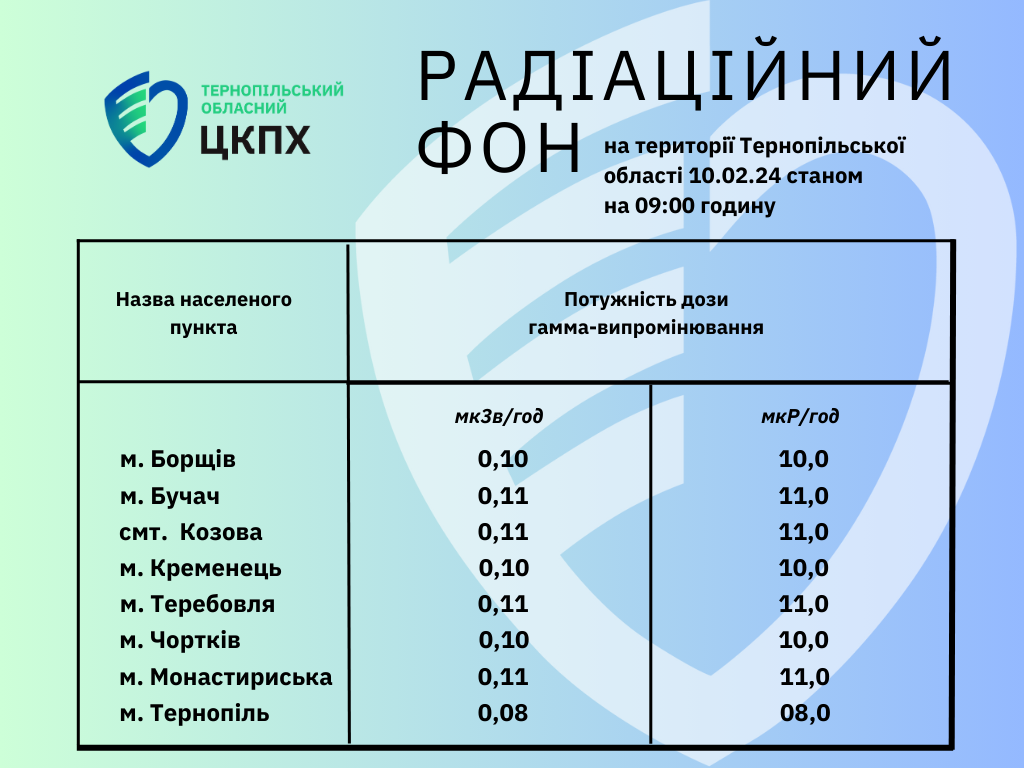 Радіаційний фон на території Тернопільської області 10.02.25 станом на 09:00 годину