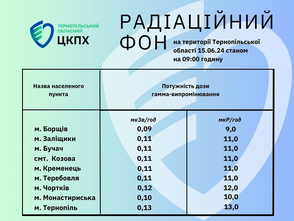 Радіаційний фон на території Тернопільської області 15.06.24 станом на 09:00 годину
