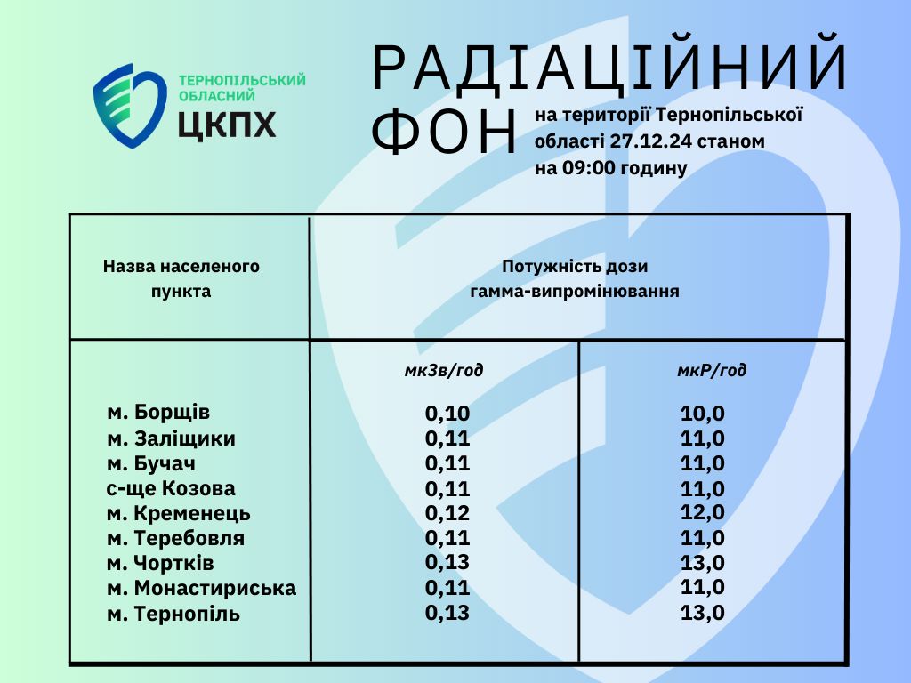Радіаційний фон на території Тернопільської області 27.12.24 станом на 09:00 годину
