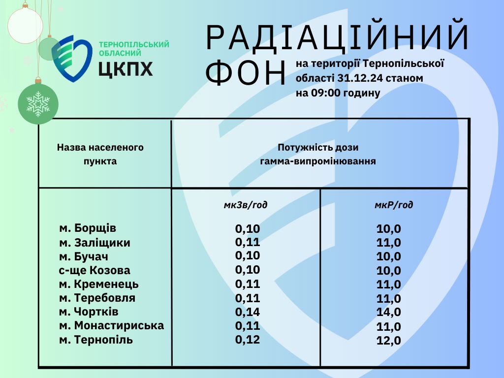 Радіаційний фон на території Тернопільської області 31.12.24 станом на 09:00 годину