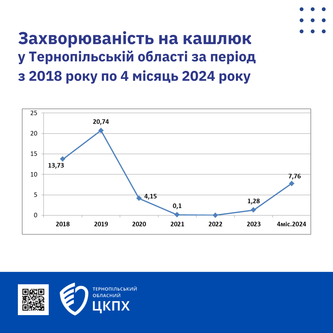 За 4 місяці 2024 року показники захворюваності на кашлюк: м.Тернопіль – 9,84 на 100 тис. населення – 22 випадки, Тернопільський район – 9,6 на 100 тис. населення – 32 випадки, Кременецький район – 7,86 на 100 тис. населення – 11 випадків, Чортківський район – 4,35 на 100 тис. населення – 14 випадків.