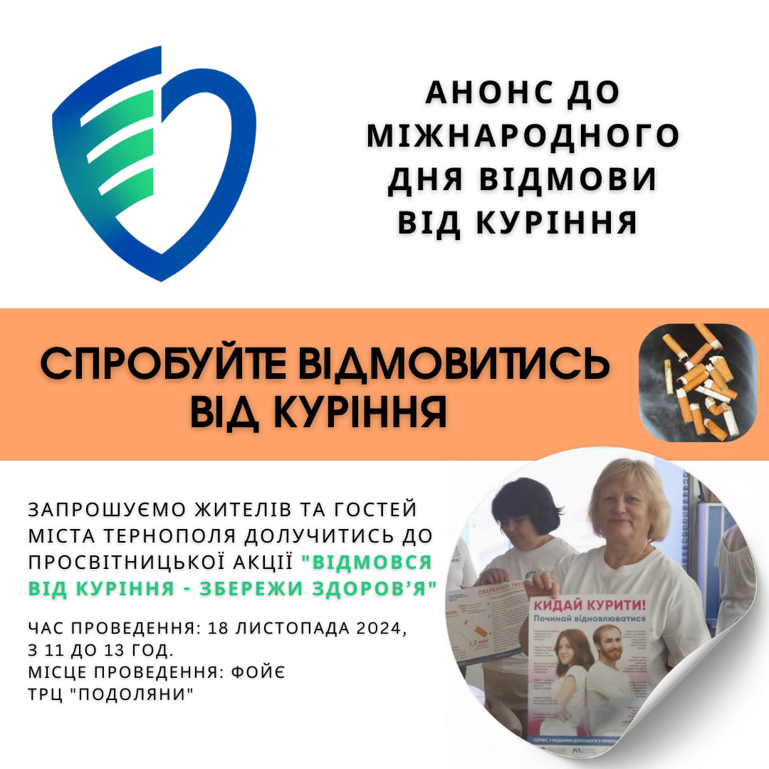 Запрошуємо жителів та гостей міста Тернополя долучитись до просвітницької акції «Відмовся від куріння – збережи здоров’я», яка буде проходити 18.11.2024 з 11.00 до 13.00 години, у фойє ТРЦ «Подоляни».
