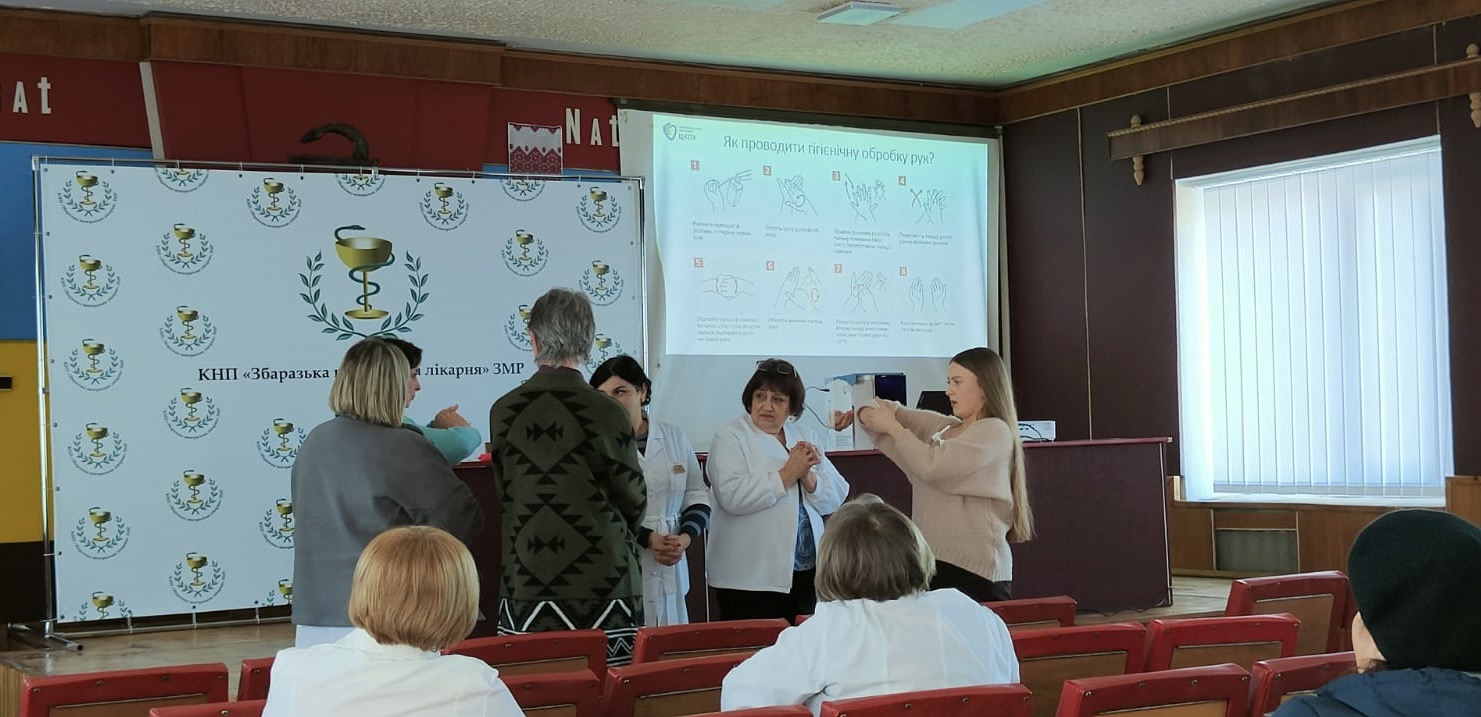 Анастасія Новосад провела практичний тренінг із гігієни рук. Здавалося б, що тут складного? Проте в медицині існують суворі стандарти: як, коли та чим саме обробляти руки, щоб звичайний дотик не став шляхом передачі інфекції. Медики відпрацювали техніку дезінфекції до автоматизму.