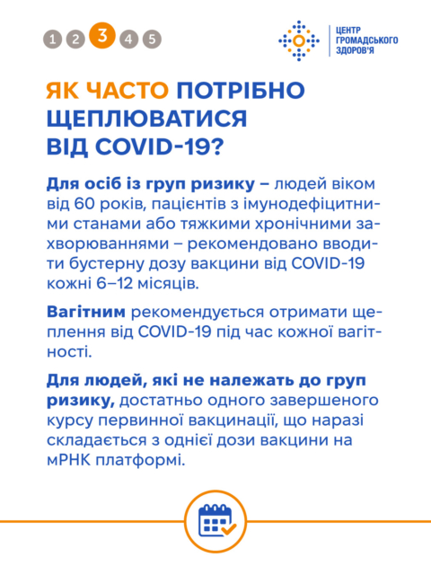 Для осіб із груп ризику — людей віком від 60 років, пацієнтів з імунодефіцитними станами або тяжкими хронічними захворюваннями — рекомендовано вводити бустерну дозу вакцини від COVID-19 кожні 6–12 місяців.