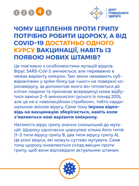 Тож, для грипу щорічна вакцинація є важливою через його мутації. Для COVID-19 — актуальне щеплення омікрон-специфічною вакциною, але щорічне оновлення (за винятком людей з груп ризику) не потрібне.