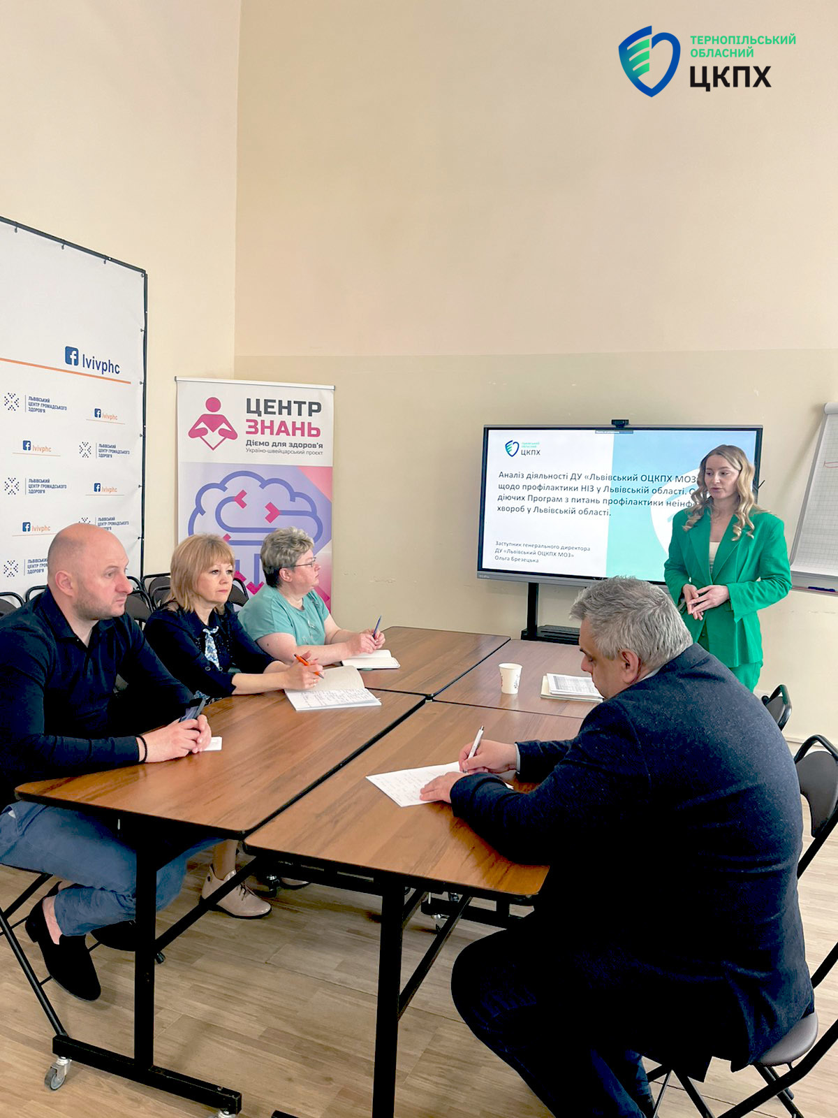 Захід відбувся за участі координатора Україно-швейцарського проєкту «Діємо для здоров’я» та представників Тернопільського, Львівського та Івано-Франківського ОЦКПХ у Центрі знань з питань профілактики, лікування та контролю неінфекційних захворювань (НІЗ), який є платформою для комунікації, обміну досвідом та знаннями серед фахівців громадського здоров’я, медичних та освітніх закладів, громад.