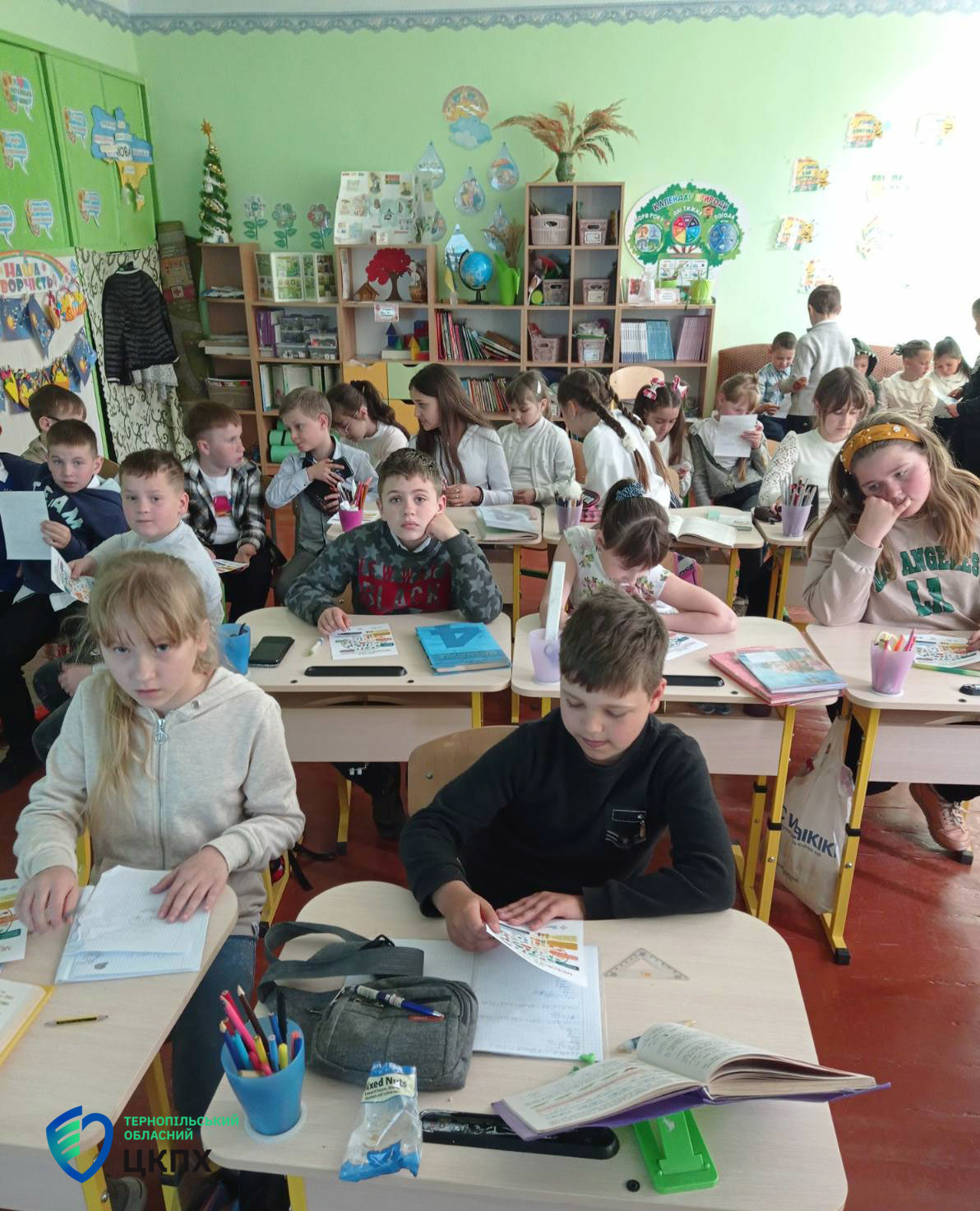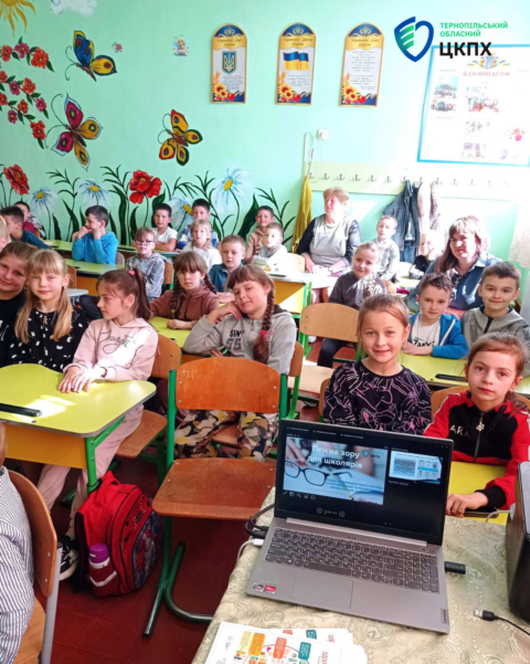 Петришин Марія, помічник лікаря-епідеміолога відділу епідеміологічного нагляду (спостереження) та профілактики неінфекційних захворювань ДУ «Тернопільський ОЦКПХ МОЗ України» провела презентації на теми «Основи здорового харчування» та «Гігієна зору» серед учнів молодших класів, надала інформацію учням про основи знань здорового харчування, про негативний влив нездорового харчування на організм, уявлення про корисну їжу, про білки, жири, вуглеводи, вітаміни, що таке трансжири, а ще – навички культури і гігієни правильного харчування, вміння вибирати корисні продукти. Також розповіла про необхідність дотримання гігієни зору під час зорового навантаження, роз’яснила що таке гімнастика для очей, провела з дітьми практичні заняття та показала як правильно виконувати вправи щодо відпочинку та гімнастики для очей.