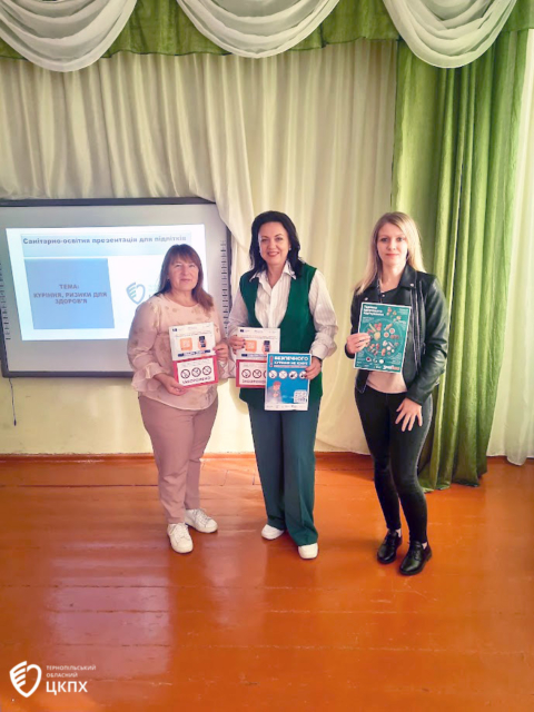Паламар Олена, лікарка-епідеміологиня відділу епідеміологічного нагляду та профілактики неінфекційних захворювань ДУ «Тернопільський ОЦКПХ МОЗ України» провела інформаційно-просвітницькі лекції та презентації на теми : «Куріння – це ризики для здоров’я». Лікарка розповіла учням 6-9-тих класів про негативний вплив куріння тютюнових виробів на організм людини, особливо на організм дітей та підлітків, міфи та факти про електронні сигарети, короткострокові та довгострокові наслідки для організму від вживання алкоголю тощо, та наголосила щодо необхідності вибору здорового способу життя.