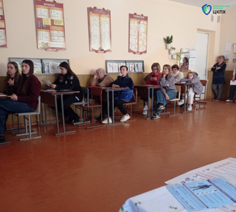 В аудиторії були присутні вчителі,технічні працівники, представник поліції та учениці 11 класу.