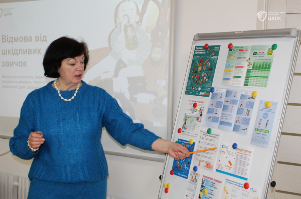 Захід провела Ірина Гричук – лікарка-методистка відділу комунікації та інформаційно-роз’яснювальної роботи ДУ «Тернопільський обласний центр контролю та профілактики хвороб МОЗ України». Вона розповіла учням про ключові чинники, що впливають на здоров’я людини, зокрема правильне харчування, фізичну активність, повноцінний сон, психологічне благополуччя та дотримання гігієнічних норм.