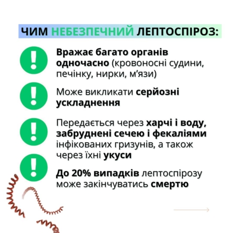 Лептоспіроз — найнебезпечніший і найпоширеніший із них. Збудник лептоспірозу передається контактним шляхом через слизові оболонки та шкірні покриви. Додаткова небезпека криється у тому, що 90% випадків починається з неспецифічних симптомів, таких як температура 39–40°C та почервоніння очей.