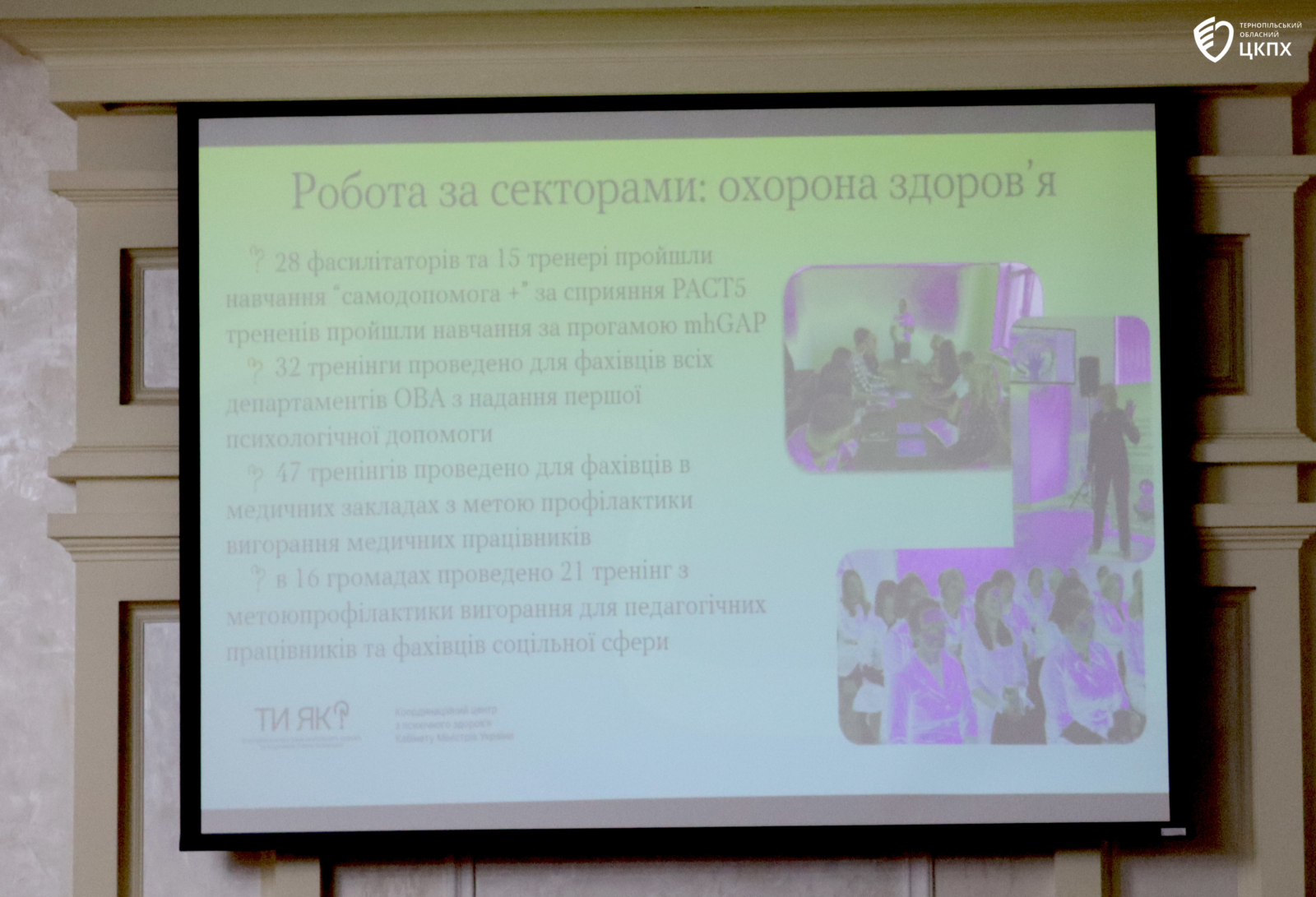 Про те, що «захід дозволив вибудовувати ефективну взаємодію з представниками Координаційного центру з психічного здоров’я КМУ, регіональними координаторами та консультантами Всеукраїнської програми ментального здоров’я областей», наголосила Оксана Чайчук, генеральна директорка ДУ «Тернопільський обласний центр контролю та профілактики хвороб МОЗ України», головна державна санітарна лікарка Тернопільської області.
