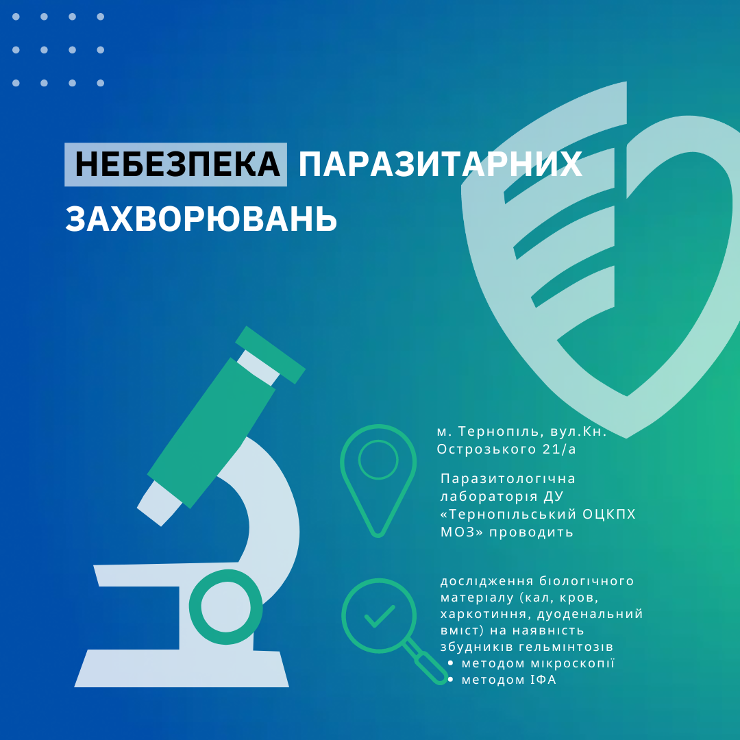 Паразитологічною лабораторією ДУ “Тернопільський ОЦКПХ МОЗ”, (знаходиться за адресою – м. Тернопіль, вул. Кн. Острозького 21/а) проводяться дослідження біологічного матеріалу (кал, кров, харкотиння, дуоденальний вміст) на наявність збудників гельмінтозів, як методом мікроскопії так і методом ІФА, який є більш чутливий, а при деяких інвазіях – єдиний можливий.