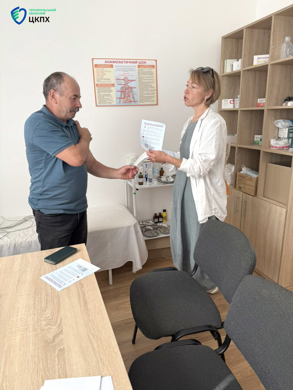 Інформаційну зустріч проведено фахівчинею Центру – завідувачкою відділу епідеміологічного нагляду та профілактики неінфекційних хвороб Бучацького відділу Чортківського міськрайонного центру ДУ «Тернопільський ОЦКПХ МОЗ України» Уляною Кланцак у співпраці з медиками КНП «Трибухівський центр ПМСД» з пацієнтами і відвідувачами ФП с. Медведівці Трибухівської ОТГ 2 липня.