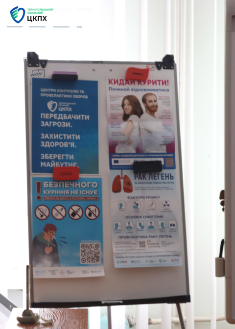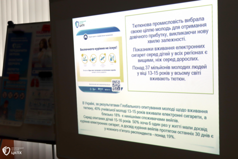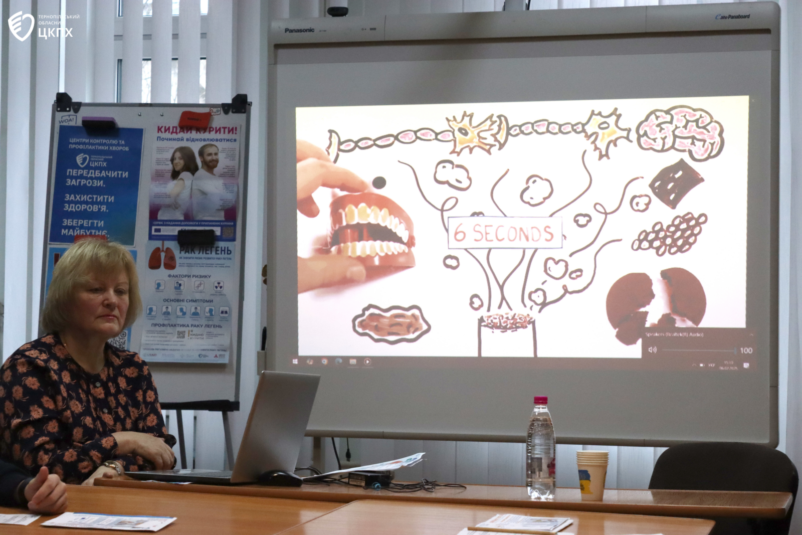 Під час інформаційного заходу Зот Галина, лікарка-методистка відділу комунікації та інформаційно-роз’яснювальної роботи ДУ «Тернопільський ОЦКПХ МОЗ України» продемонструвала презентаційну лекцію на тему «Тютюнопаління та його шкідливі наслідки».