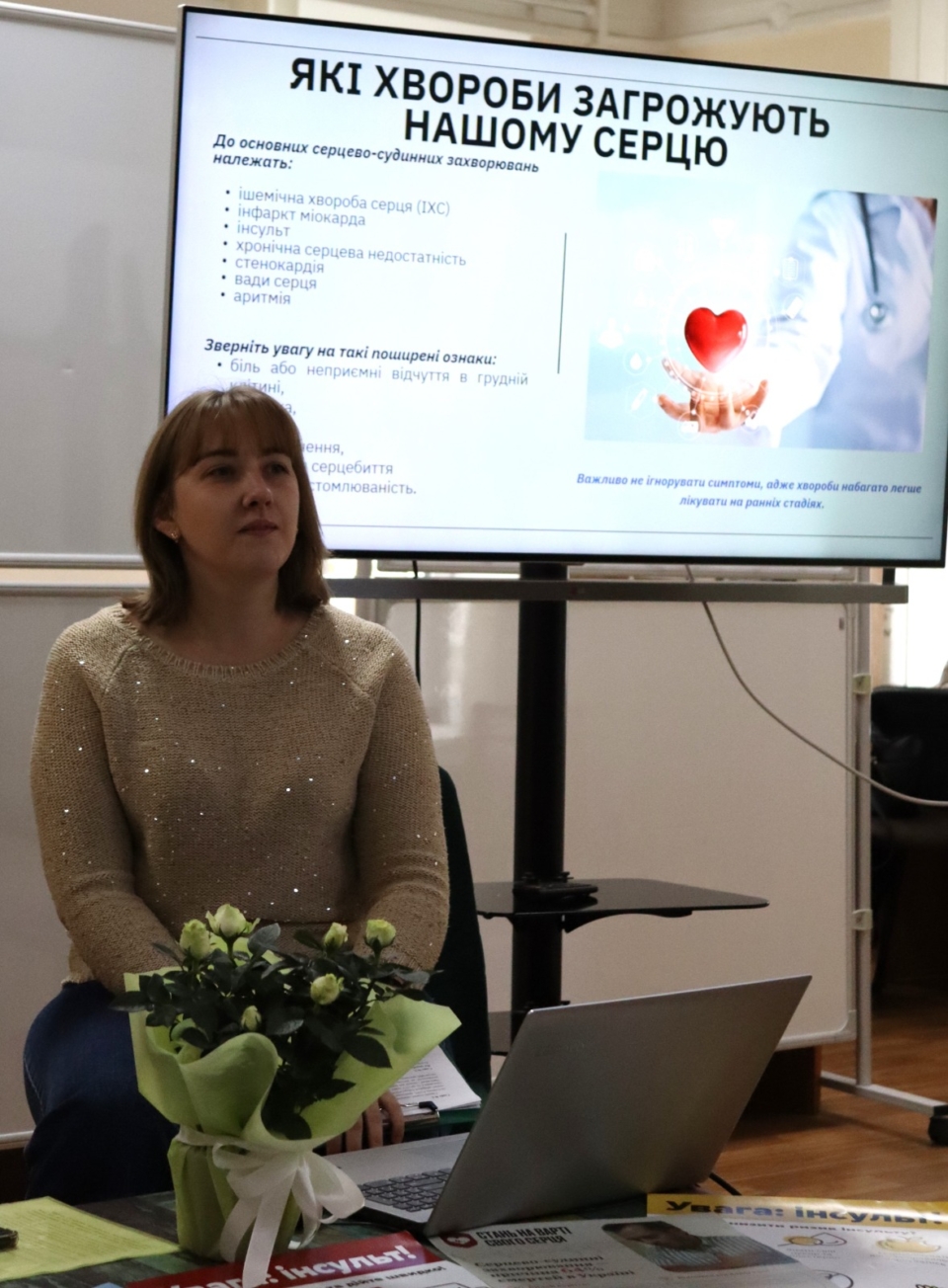Спікери детально розповіли про серцево-судинні захворювання, їхні тривожні симптоми та про те, як запобігти їм, зосередивши увагу на основних факторах ризику, таких як неправильне харчування, гіподинамія, стрес та шкідливі звички.