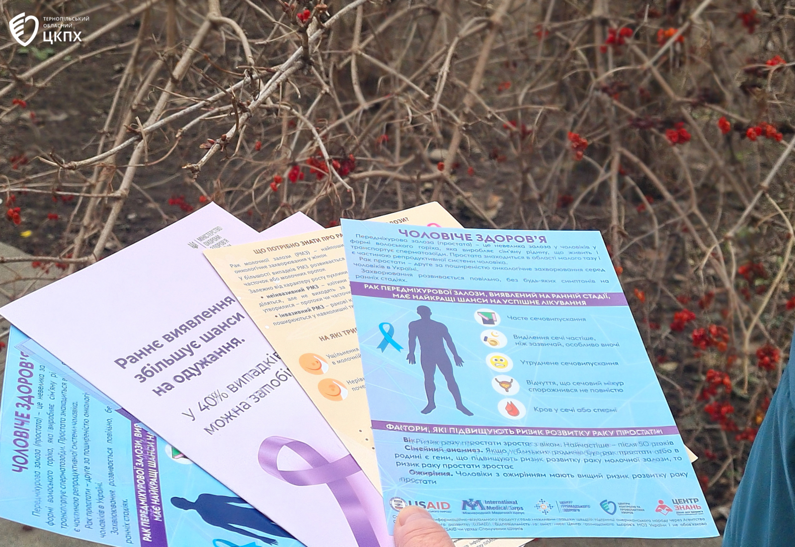 Фахівцями відділу комунікації та інформаційно-роз’яснювальної роботи ДУ «Тернопільський ОЦКПХ МОЗ» розповсюджено інформаційно-просвітницьку літературу Центру: «Профілактика онкозахворювань», «Календар можливих обстежень для раннього виявлення раку або передракових станів», «Онкоскринінг» (обстеження для чоловіків та жінок), «Корисні поради для вашого здоров’я (для внутрішньо переміщених осіб), ліфлети «Чоловіче здоров’я» (рак передміхурової залози; фактори, які підвищують ризик розвитку раку простати; скринінг та діагностика раку простати; прості кроки, які допоможуть зменшити ризик розвитку раку простатиту; ліфлети «Жіноче здоров’я» (що потрібно знати про рак молочної залози; на які тривожні ознаки варто звернути увагу; фактори, які підвищують ризик розвитку РМЗ; як виявити рак молочної залози; як проводити самообстеження молочних залоз; що потрібно знати про рак шийки матки; на які тривожні ознаки слід звернути увагу; як зменшити ризик розвитку РШМ; прості кроки для зниження ризику розвитку РМЗ та РШМ, змініть свій спосіб життя).