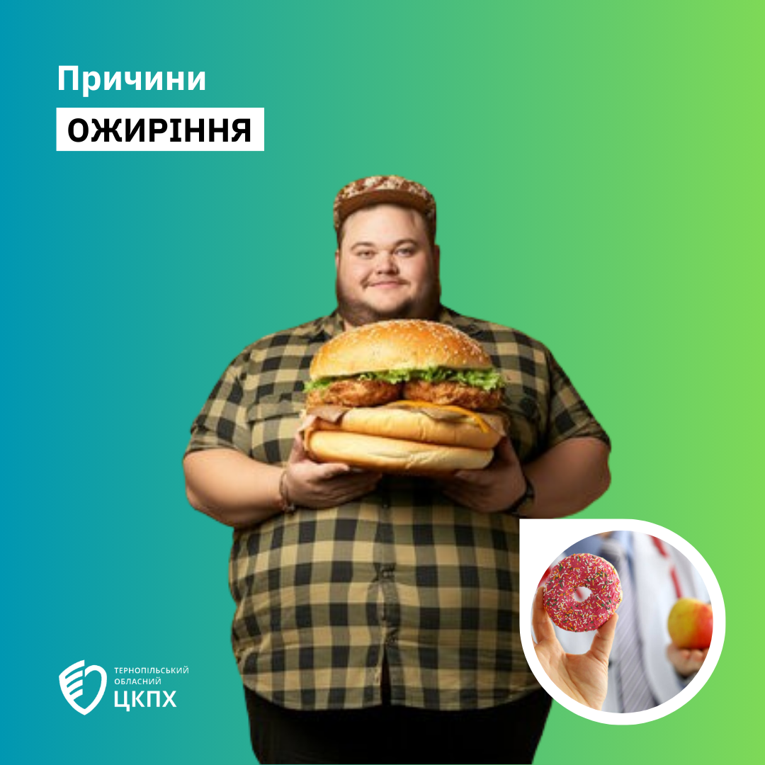 Ожиріння викликано підвищеним споживанням калорій. Іншими словами, коли ви їсте більше, ніж вам потрібно. Ці зайві калорії не використовуються для виробництва енергії, і відкладаються організмом у вигляді жиру, внаслідок чого підвищується вага. Точніше кажучи, в середньому 500 зайвих калорій в день будуть зайвими 0,5 кілограмами в тиждень.