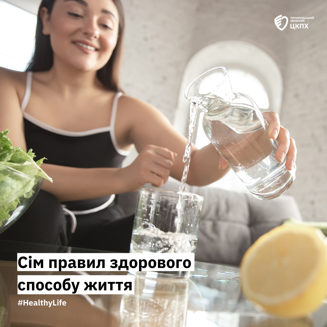 - Збалансоване харчування.Багато людей через роботу, освіту та брак часу переходять на систему швидкого харчування, тобто замінюють приготування на фастфуд. Здоров’я забезпечує правильне харчування, яке складається з вживання здорових продуктів, збагачених вітамінами. Це овочі, фрукти, м’ясо та молочні продукти, риба, різноманітні зернові.Важливо часто харчуватися (4-5 разів на день) і невеликими порціями. У раціон включати тільки легку їжу, наприклад, салати, супи, каші. Також важливо дотримуватися дієти та пити негазовану воду, яку потрібно вживати не менше 1,5 літра на день. Чай, кава, супи не рахуються!