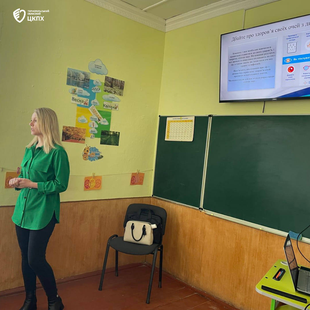 Петришин Марія – помічниця лікаря-епідеміолога відділу епідеміологічного нагляду (спостереження) та профілактики неінфекційних захворювань ДУ «Тернопільський ОЦКПХ МОЗ» розповіла учням молодших класів про важливість та принципи здорового харчування і гігієну зору.