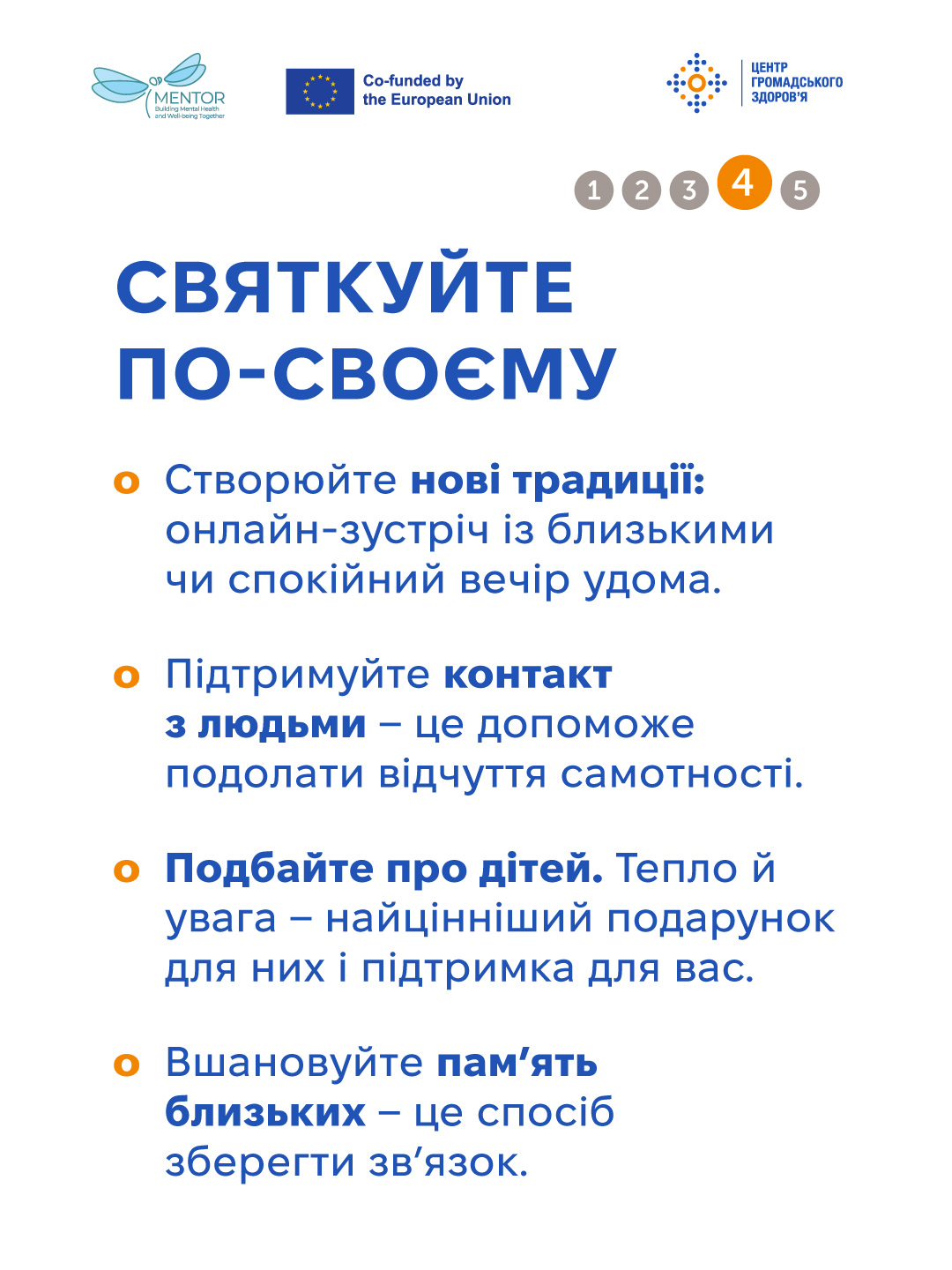 Проте і дозволити собі радість — це не зрада, а спосіб відновити сили й підтримати себе та людей поруч. Разом з тим небажання долучатися до святкування — це нормально, і змушувати себе до веселощів не варто. Центр громадського здоров’я наводить кілька практичних порад, як упоратися з переживаннями та зробити святковий період комфортним.