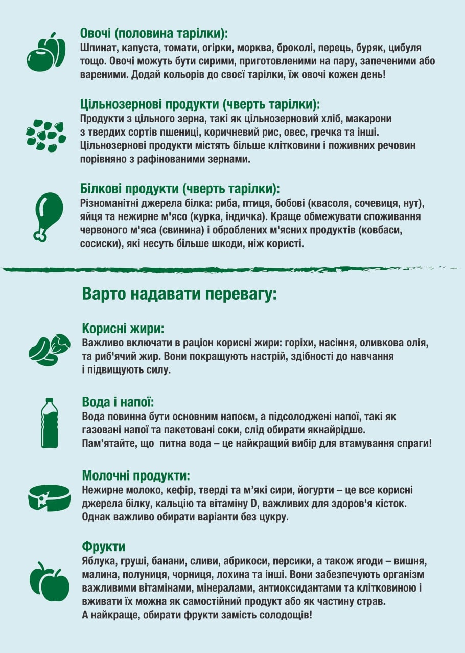 Здорова тарілка допомагає легко контролювати порції і забезпечити різноманітність у раціоні, що робить здорове харчування простим і доступним. Пам’ятайте, що кожен прийом їжі – це можливість зробити здоровий вибір і покращити своє самопочуття.