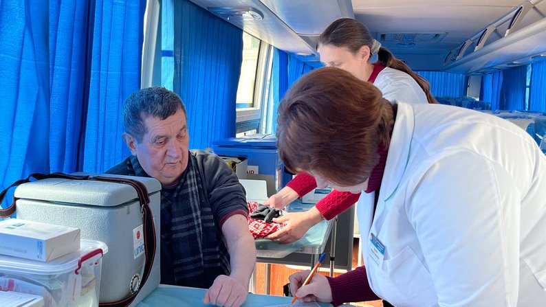 В автобусі працює мобільна бригада первинної медико-санітарної допомоги. Сімейна медсестра Марія Кулява каже, перед вакцинацією запитує про стан здоров’я та вимірює тиск.