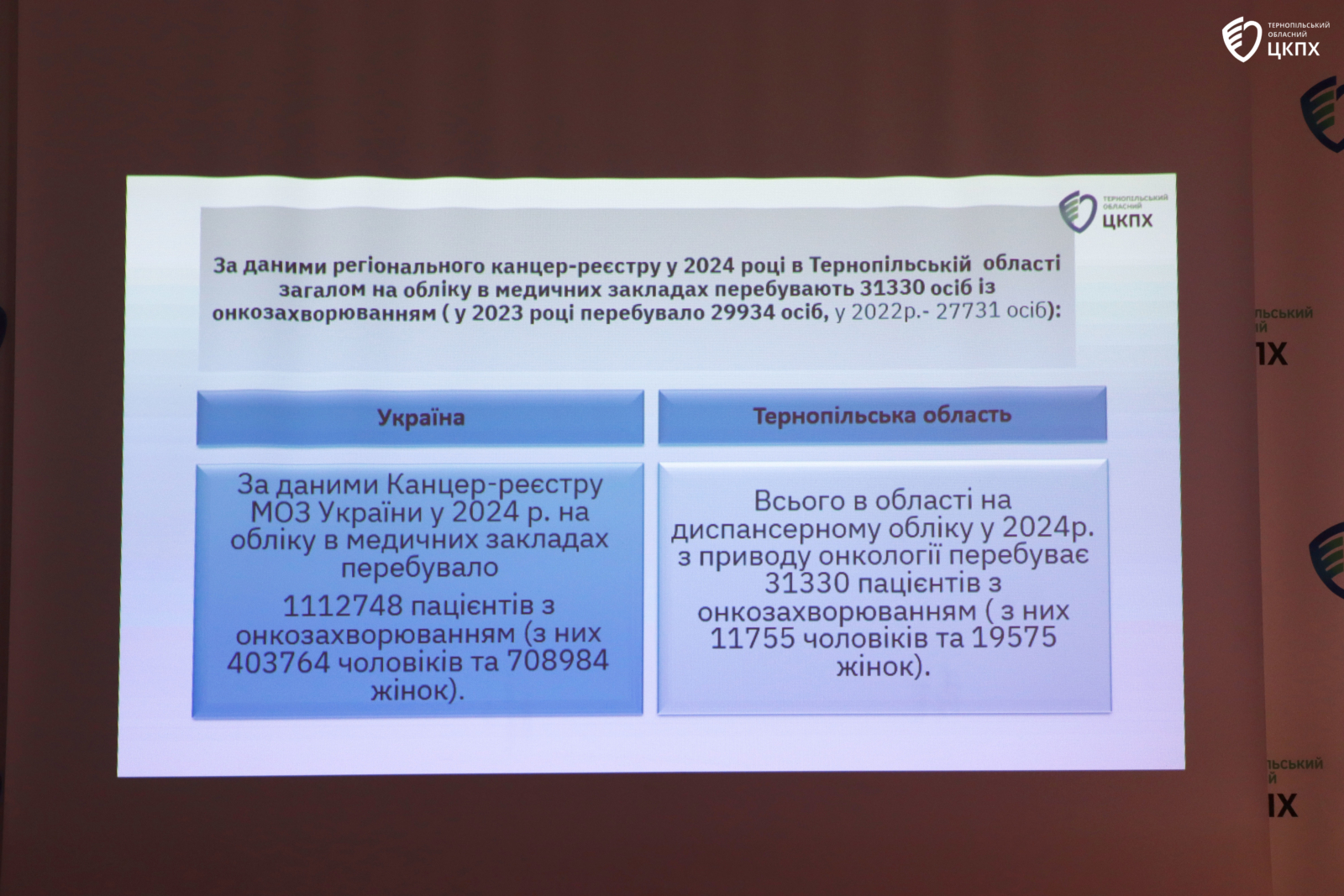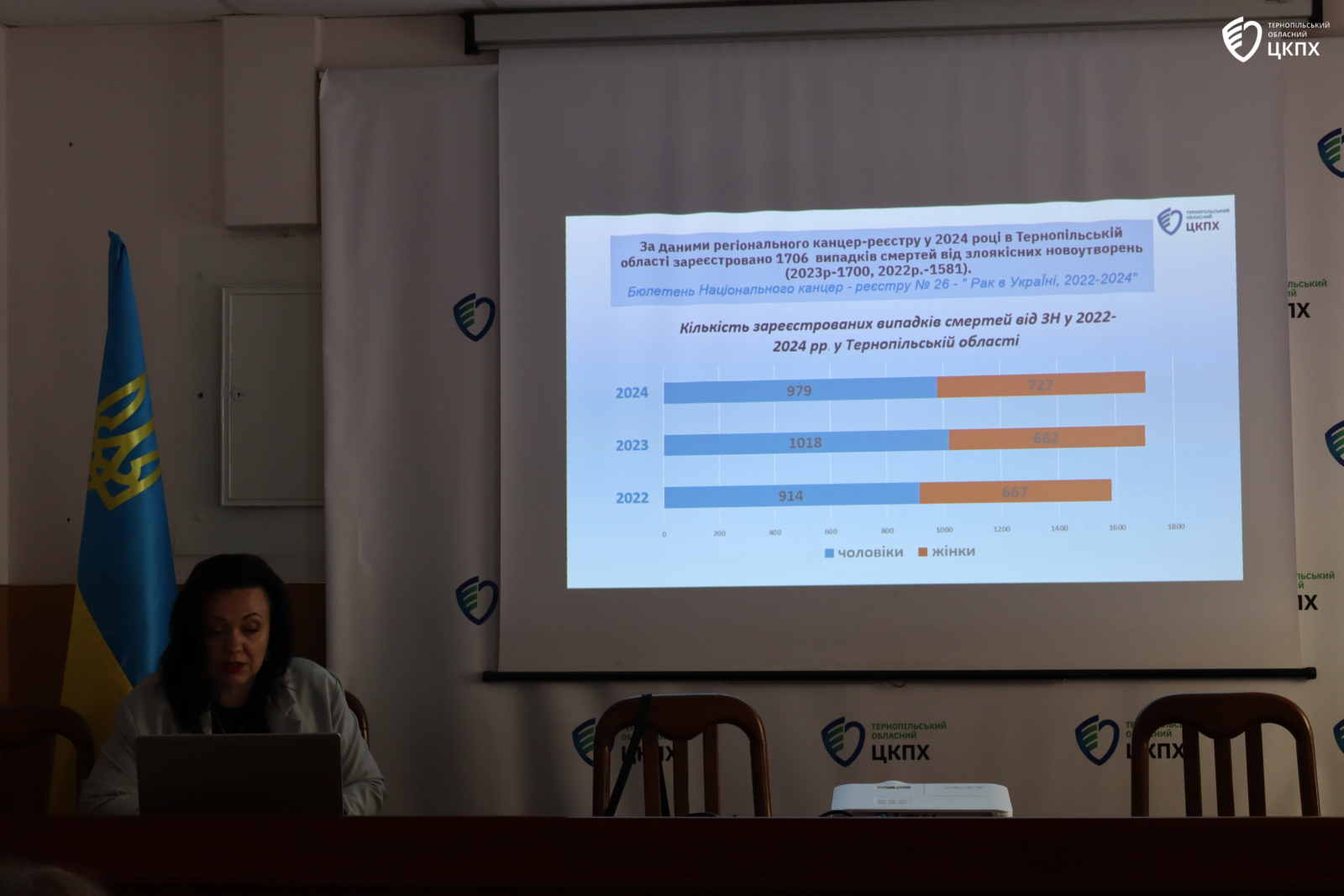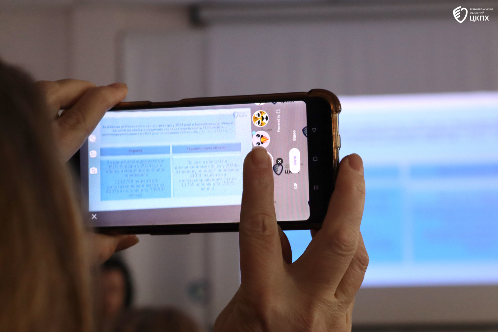 В межах заходу лікар-епідеміолог Олена Паламар висвітлила загальні аспекти онкологічних захворювань, їх актуальність та поширеність, а також представила наочну презентацію щодо профілактики раку молочної залози, раку шийки матки, раку легень, колоректального раку та раку передміхурової залози.