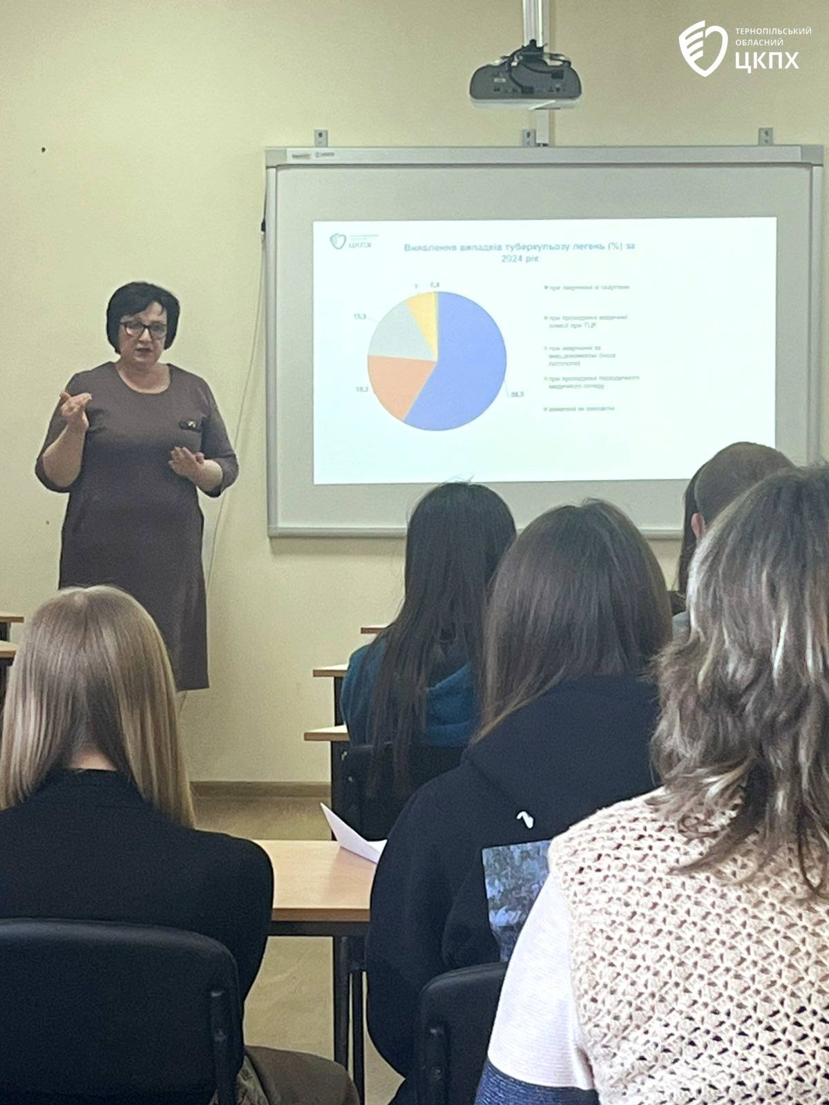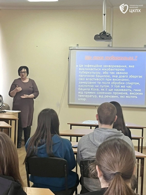 Сьогодні, 19 березня, Уляна Вахула, завідувачка відділу епідеміологічного нагляду та профілактики інфекційних хвороб Борщівського відділу Чортківського міжрайонного центру ДУ «Тернопільський обласний центр контролю та профілактики хвороб МОЗ України» здобувачам освіти 10-11 класів Скала – Подільського НВК «ЗНЗ І-ІІІ ст. – ДНЗ» презентувала лекцію «Проблема туберкульозу у світі, Україні, регіоні та районі» з метою захисту здоров’я дітей та молоді, а також формування навичок здорового способу життя.