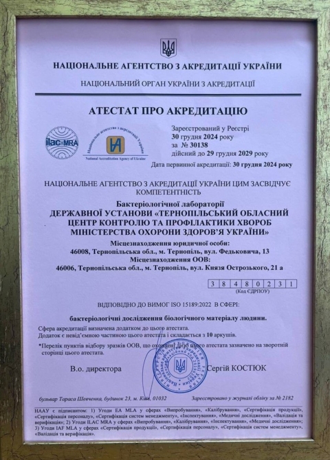 Сертифікація за ISO 15189:2022 підтверджує прагнення фахівців Тернопільського обласного центру контролю та профілактики хвороб МОЗ України до постійного вдосконалення задля забезпечення найкращої якості лабораторної діяльності.