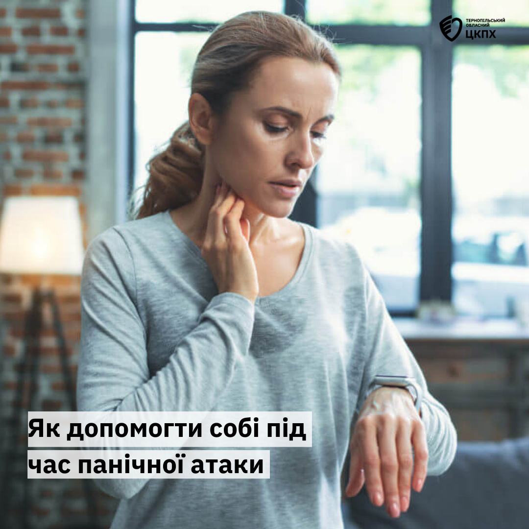 Під час панічної атаки (ПА) дуже важливо спробувати концентруватися на поточному моменті й ситуації всіма видами почуттів, «заземлитися». Головний прийом − поставити ступні на підлогу (це допоможе відчути опору).