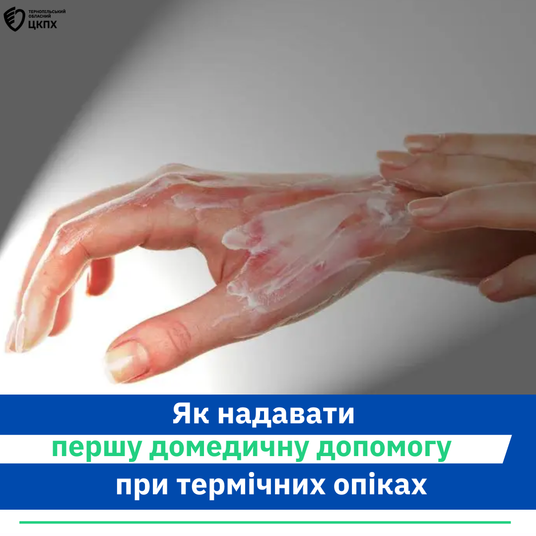 У разі отримання термічних опіків — пошкоджень шкіри внаслідок контакту із вогнем, гарячою парою, рідиною, окропом, розпеченим предметом: