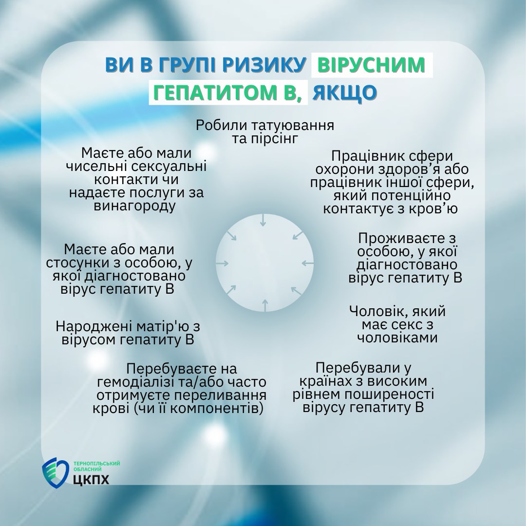 Гепатит В – це вірусна інфекція, що вражає печінку і може викликати як гостру, так і хронічну форми хвороби. Вірус передається контактом із кров’ю або іншими рідинами організму інфікованої людини (сім’яною, вагінальною). Вірус гепатиту В може виживати за межами організму людини щонайменше сім днів. Протягом цього періоду вірус може викликати інфекцію при потраплянні в організм людини, яка незахищена вакциною.