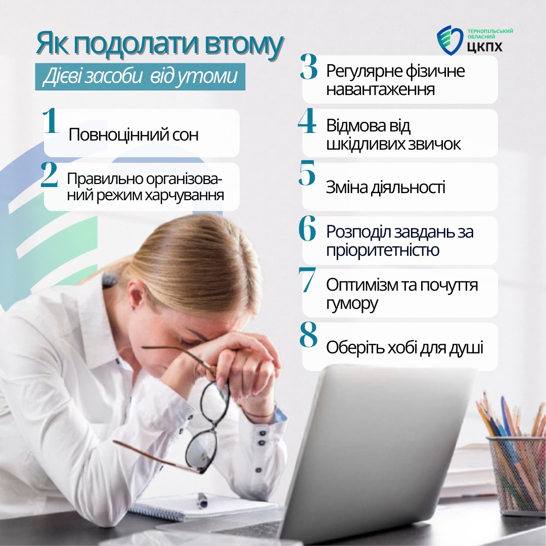 За великої завантаженості не соромтеся звернутись по допомогу до колег. На роботі організуйте нетривалі, бажано активні, паузи, в обідню перерву вийдіть на свіже повітря та прогуляйтеся пішки 20-30 хв.