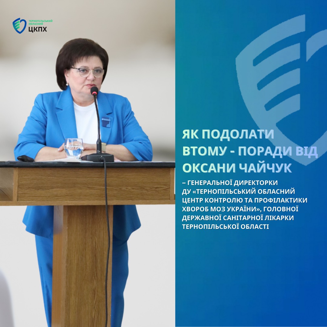 Як подолати втому – поради від Оксани Чайчук, генеральної директорки ДУ «Тернопільський обласний центр контролю та профілактики хвороб МОЗ України», головної державної санітарної лікарки Тернопільської області.