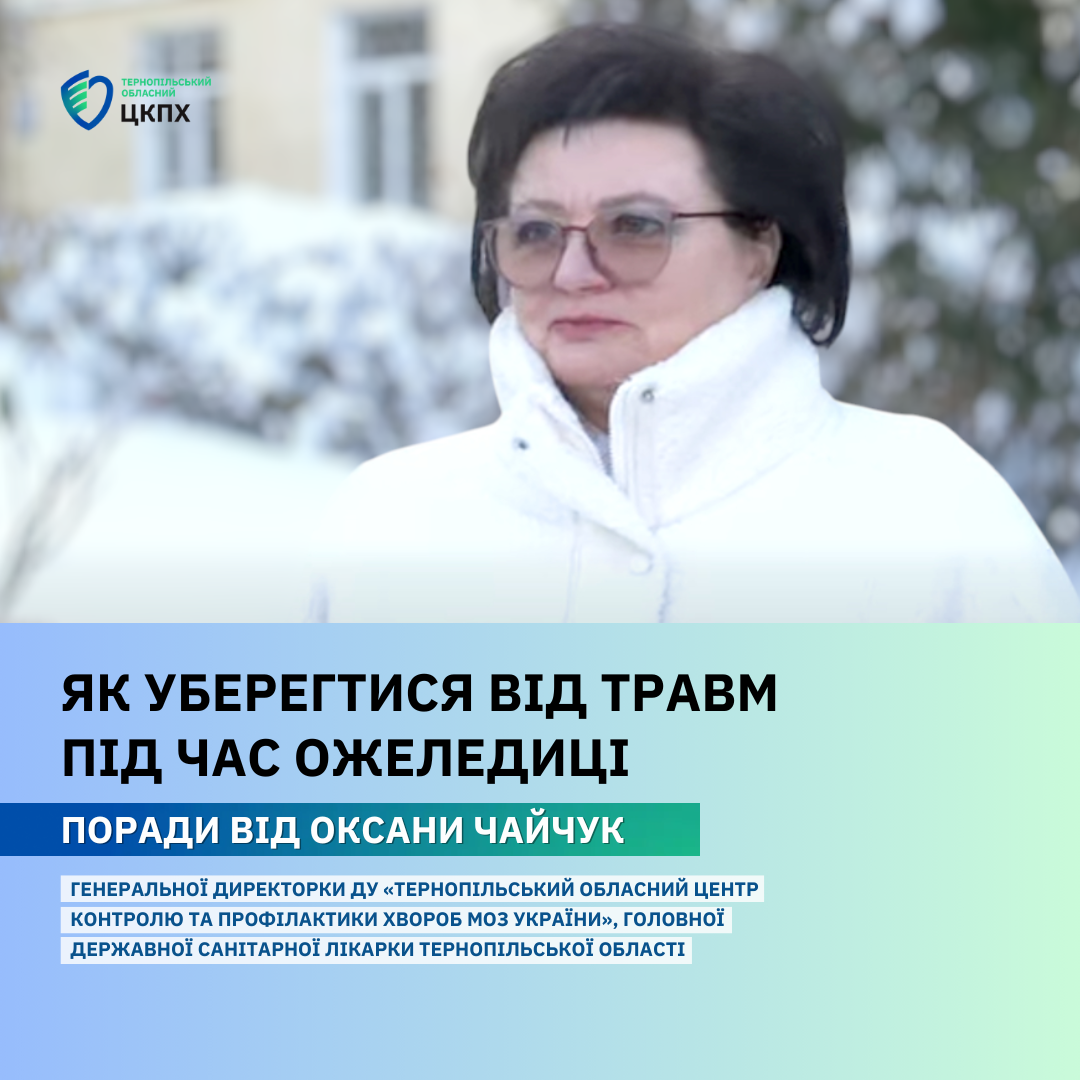 Разом з Оксаною Чайчук – генеральною директоркою ДУ «Тернопільський обласний центр контролю та профілактики хвороб МОЗ України», головною державною санітарною лікаркою Тернопільської області – даємо кілька порад, які захистять від травмування при ожеледиці.