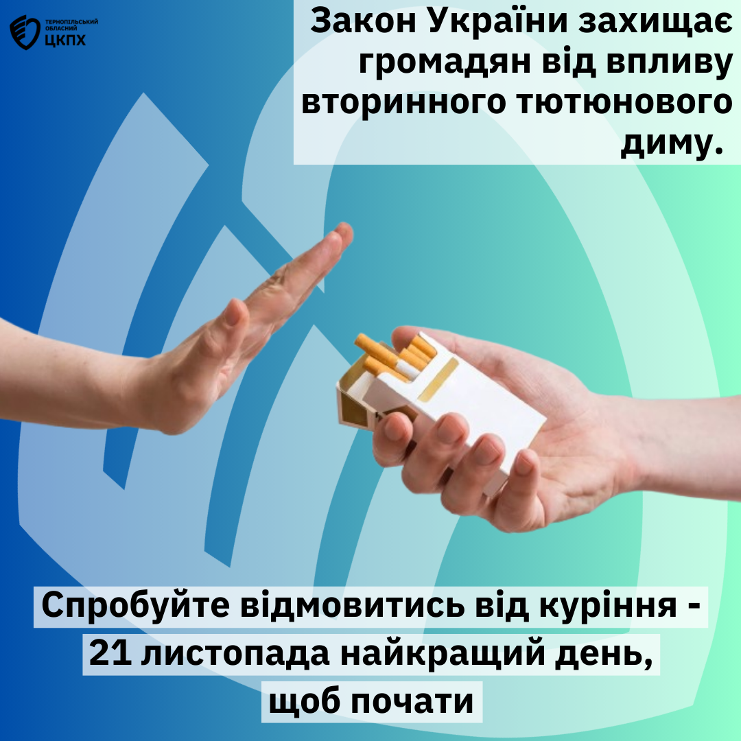 Закон України захищає громадян від впливу вторинного тютюнового диму. Спробуйте відмовитись від куріння – 21 листопада найкращий день, щоб почати